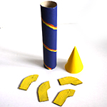 1- Imprimer le cône en papier et le patron des pieds de la fusée. Découper les ailerons de la fusée dans le carton, en prenant soin de bien découper la fente qui permettra de les faire tenir au corps de la fusée.