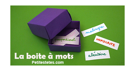 Nous comprenons beaucoup plus de mots que nous en utilisons. On parle ainsi de vocabulaire actif et de vocabulaire passif. Si la compréhension est la première étape de l’enrichissement du lexique, l’utilisation des mots en est la seconde étape. Sans transformer son enfant en singe savant qui parlerait comme un dictionnaire, on peut l’inciter à réutiliser les mots complexes qu’il a découvert dans les derniers jours, ou bien en puisant au hasard dans la boîte à mots. Cela permettra d’ancrer le sens de ces mots, mais aussi à votre enfant de se les approprier pour les utiliser à l’oral ou l’écrit…